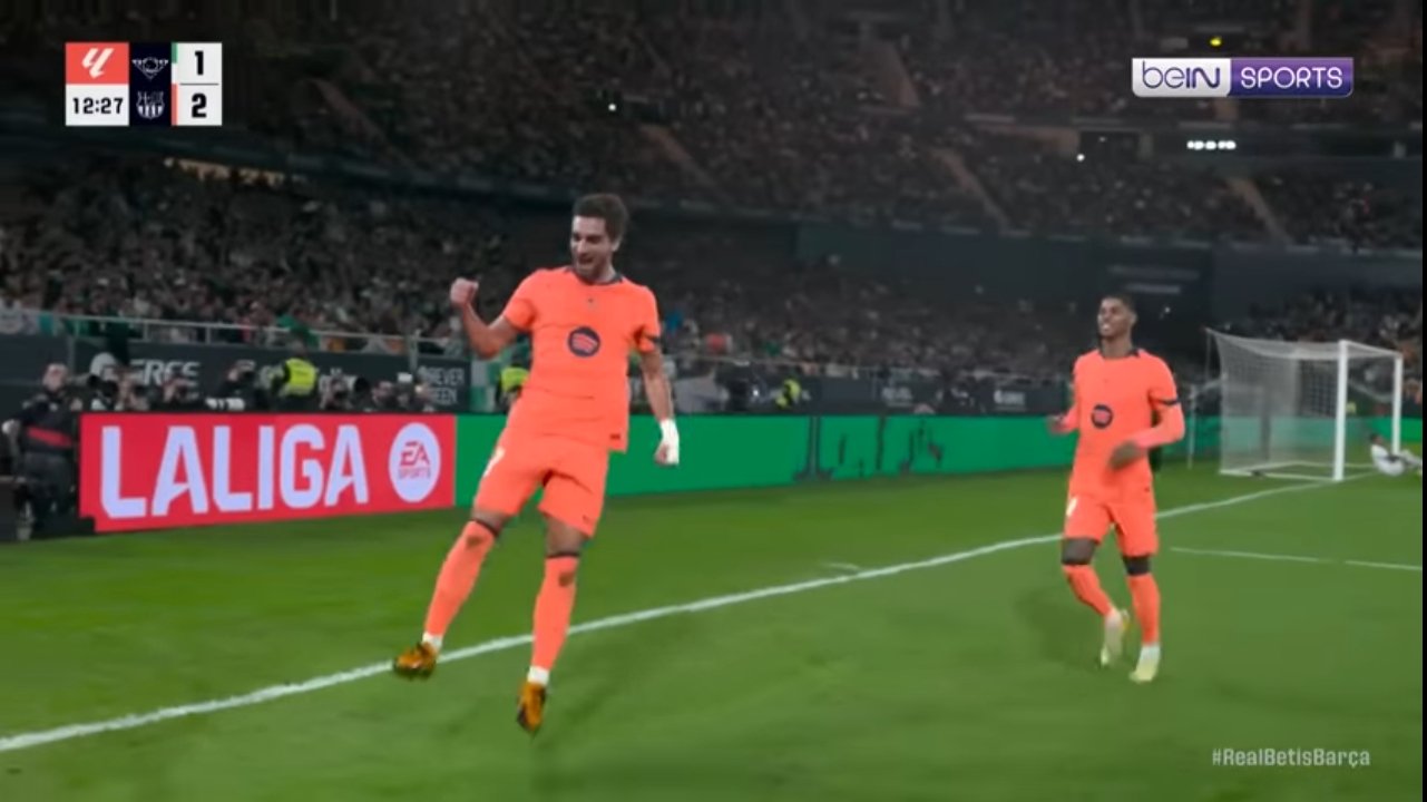 Ferran Torres berhasil membuat hatrick setelah tendangannya dari luar kotak penalti berhasil menjebol gawang Real Betis, skor 1-4 untuk Barcelona hingga turun minum.