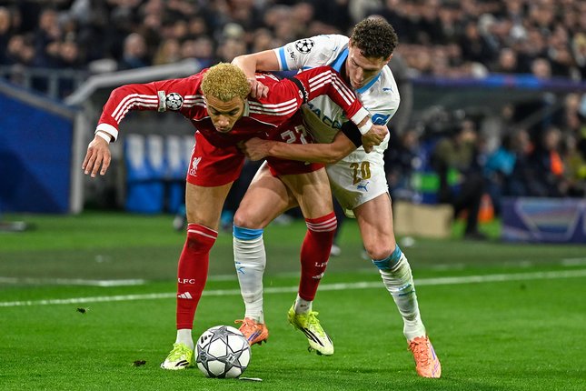 Foto: Hamed Traore berebut bola dengan Hugo Ekitike dalam laga Liga Champions antara Marseille vs Liverpool di Stade Velodrome, 22 Januari 2026 (c) AP Photo/Philippe Magoni
