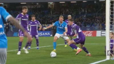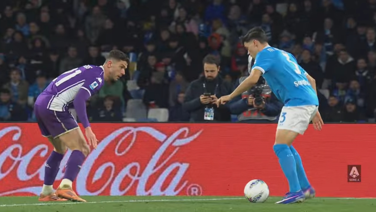 Foto: Pemain Napoli, Miguel Guiterrez berusaha melewati pemain belakang Fiorentina sebelum melakukan tendangan melengkung yang fantastis/tangkapan layar @seriea